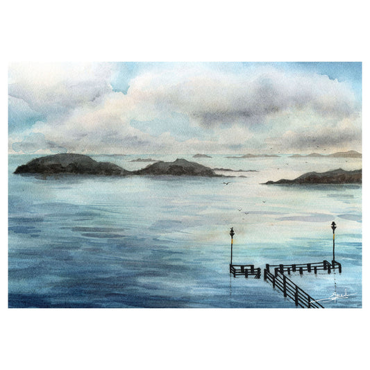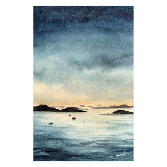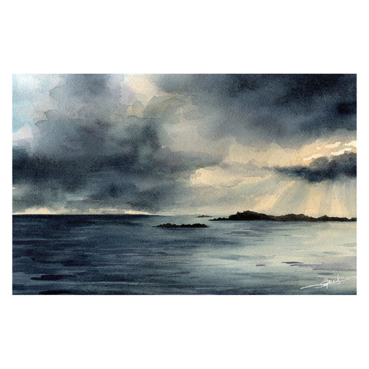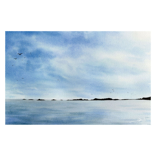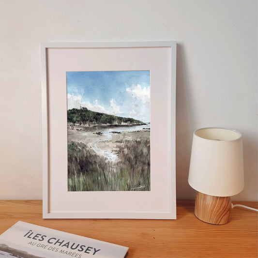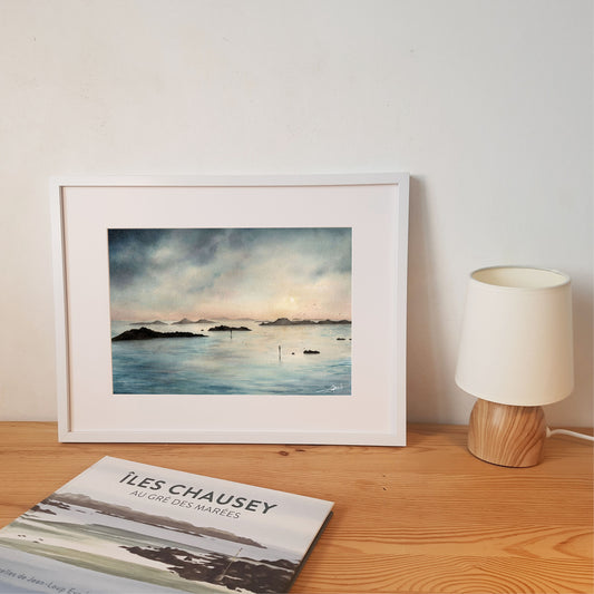 Chausey est un archipel magnifique au large de Granville (Normandie) où j'ai eu la chance de passer des vacances chaque année depuis l'enfance. J'y travaille depuis maintenant quatre ans en tant que saisonnière et il me semble avoir enfin réussi à retranscrire ce que j'aime dans ce paysage constamment en mouvement.