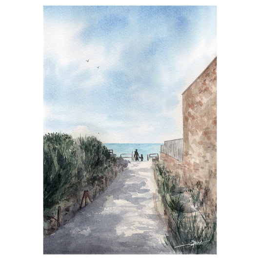 J'aime me promener dans les ruelles de Coutainville, sur la digue et à la Pointe d'Agon. Il se dégage de cet endroit une douceur et un air de vacances permanent, c'est ce que j'ai cherché à retransmettre à travers cette série d'aquarelles réalisées en 2024.
